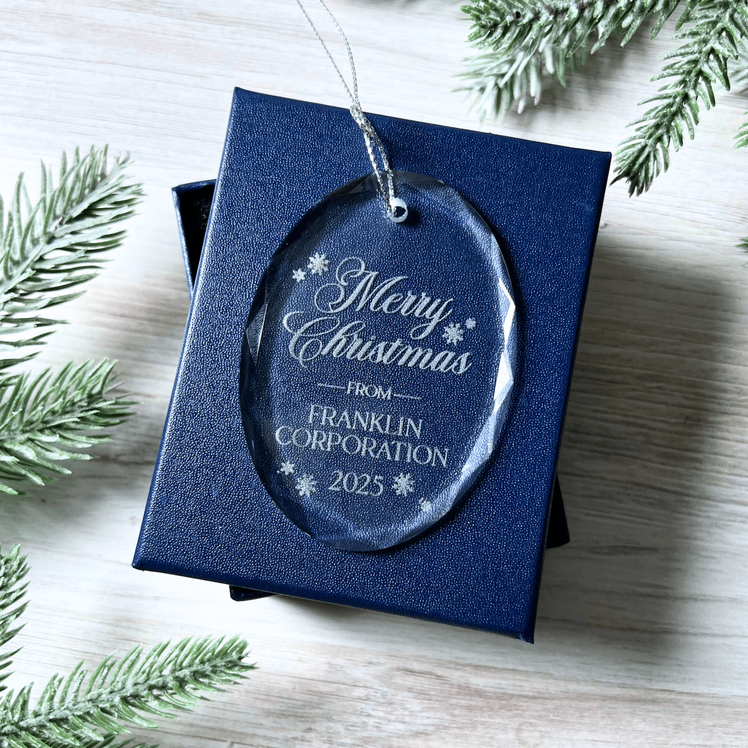 This oval crystal ornament offers a refined and sophisticated option for corporate holiday gifting. Made from premium optic crystal, each piece is laser engraved with a frosted finish that highlights your logo or message with exceptional clarity. The elegant beveled edge adds a touch of luxury, making this a standout corporate keepsake.